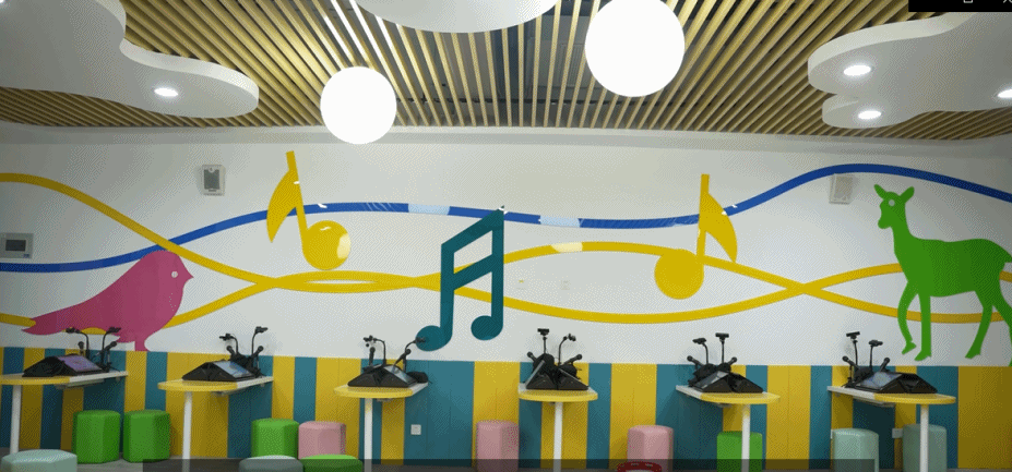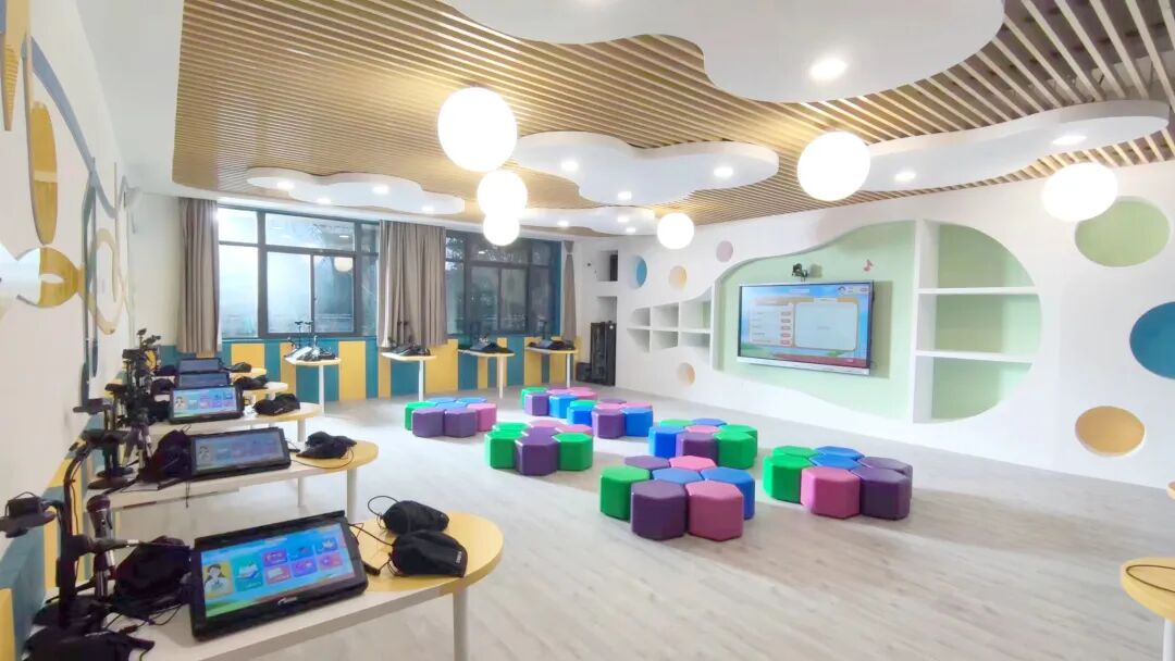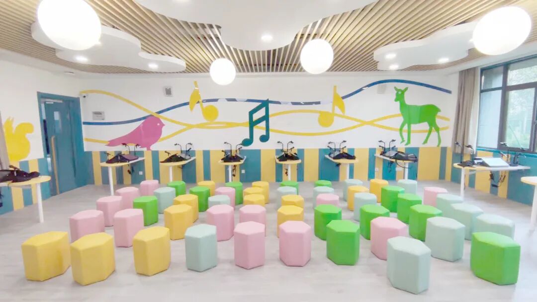 有別于傳統(tǒng)的音樂教室,這個音樂教室整體采用弧形結(jié)構(gòu),裝潢色彩鮮艷奪目。